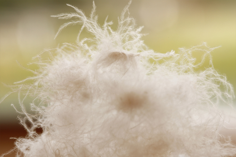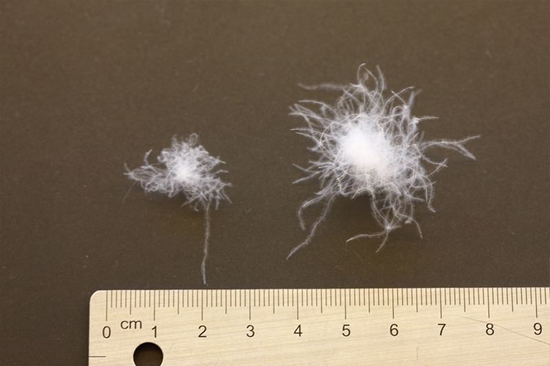 原毛はロシア北部の山岳地帯や、カナダの北極圏など、厳しい気候で育てられたグースから採取したもの。平場で放し飼いされたグースからシーズン中に何度かに分けて胸の毛を採取します。薬漬けにされ、汚物にまみれて育った中国製のブロイラーダックとは違い、生育地域も環境も雲泥の差。その差は安全性だけでなく、暖かさや耐久性にも表れます。