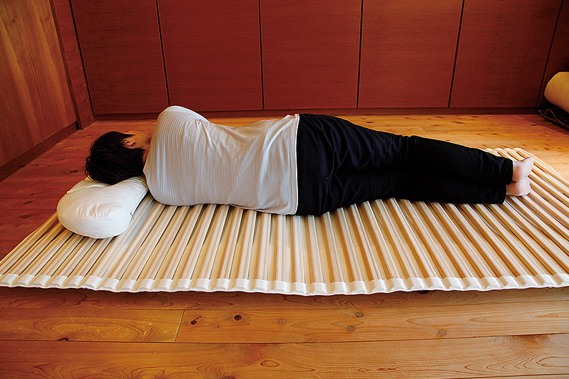 たとえば横になって寝たとき、硬い寝具ですと肩やおしりがぶつかり、背骨を歪ませてしまうのですが、「ふとんエレメント」なら肩やおしり部分の板がぐっと沈み、腰部分は板が身体にフィットして支えてくれるので、常に背骨はまっすぐに保たれます。