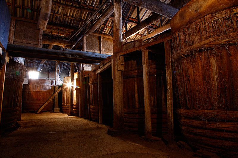 ▼もろみを絞っでできた醤油を、木桶でさらに2年間熟成。