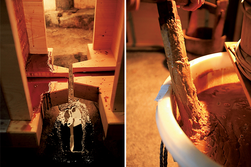 押し槽と呼ばれる、てこの原理を利用した箱の中に白下糖を入れて圧力をかけ、中に含まれる糖蜜をゆっくりと押し出していくと、蜜が抜けた分、褐色だった白下糖は色が抜けて白くなっていきます。一回だけではまだまだ糖蜜が多いのですが、水分が抜けてしまった状態で圧力をかけ続けても、それ以上白くなることはありません。そこで、水を加えて練ることで糖蜜を溶け出させ、また押し槽に入れて圧力をかけて、という作業を繰り返すことで徐々に糖蜜を抜き、白くしていく方法ができあがったのです。