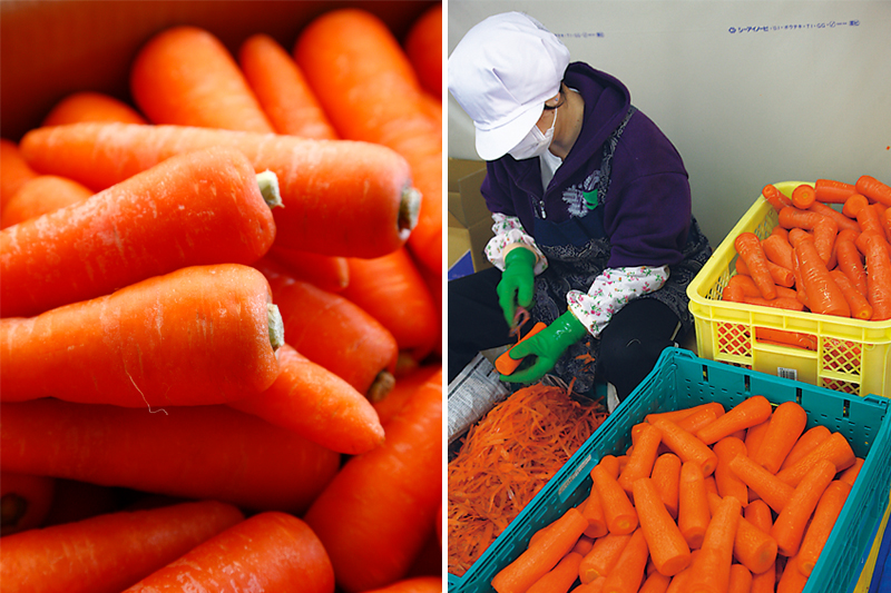 ニンジンはすべて手作業で皮を剝いてからジュースにするのです。