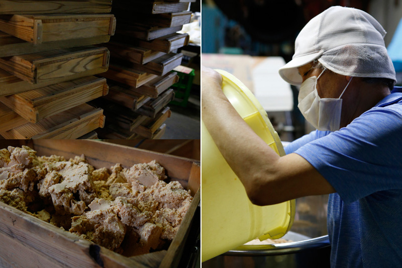 仕込み中のオリジナル味噌は、たんぱく質豊富で艶やかな色白大豆「エンレイ」に、米糀には減農薬栽培の新潟県産コシヒカリ、塩は天日塩を使用。