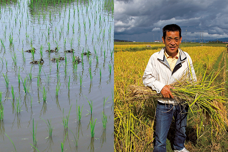 マガモ、またはアイガモ農法は、カモに水田を泳ぎ回って雑草や害虫を食べてもらいます。農薬や除草剤などの薬剤を使わないで雑草や害虫を除去できる、環境にも体にもやさしい方法です。